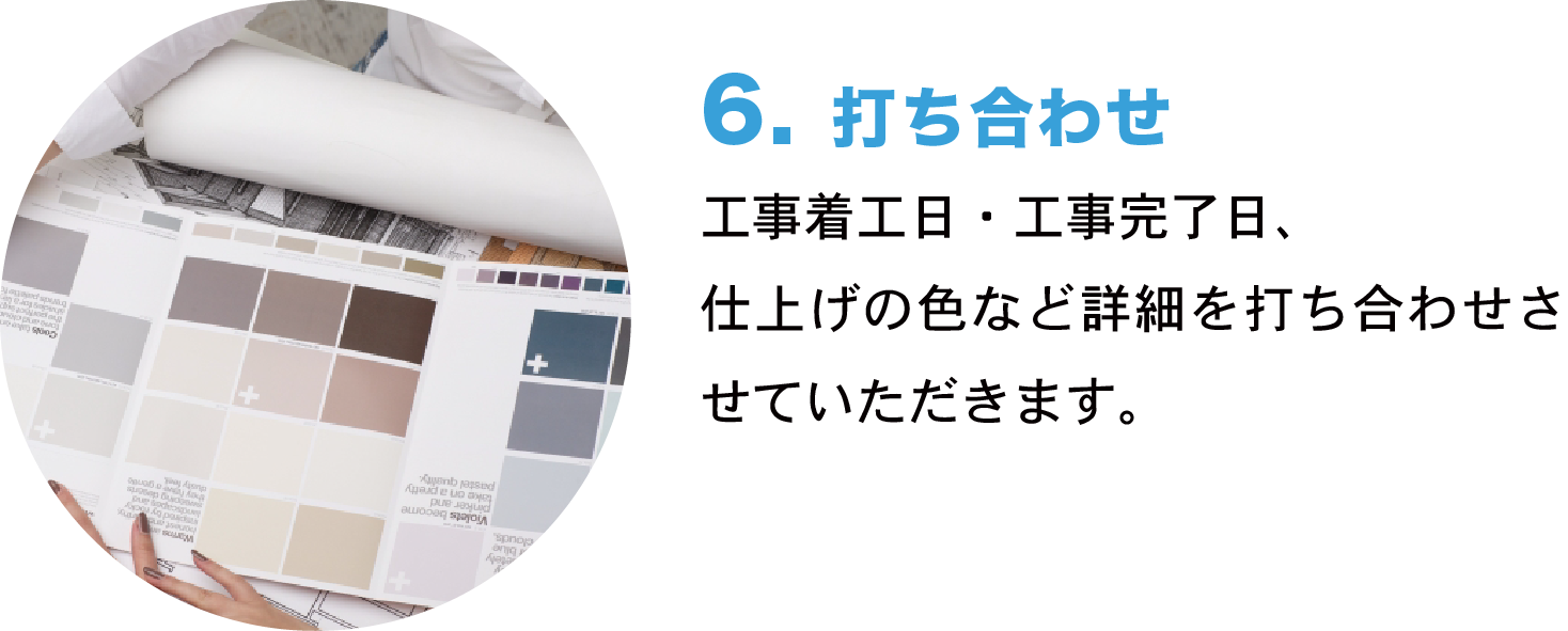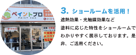 地域密着の施工を大事に考えており、「家のかかりつけ医」として様々な相談をしていただけるようショールームを併設しております。ショールームでは他のお客様の工事例・実績はもちろん、建材メーカーから出されている各種資料、実際に施工をするさいの色あいなど細かいところまでご相談できます。